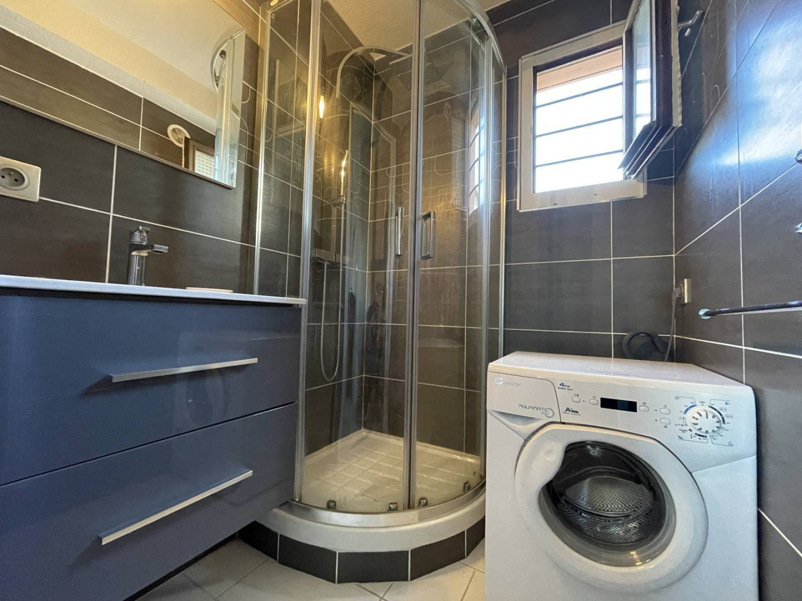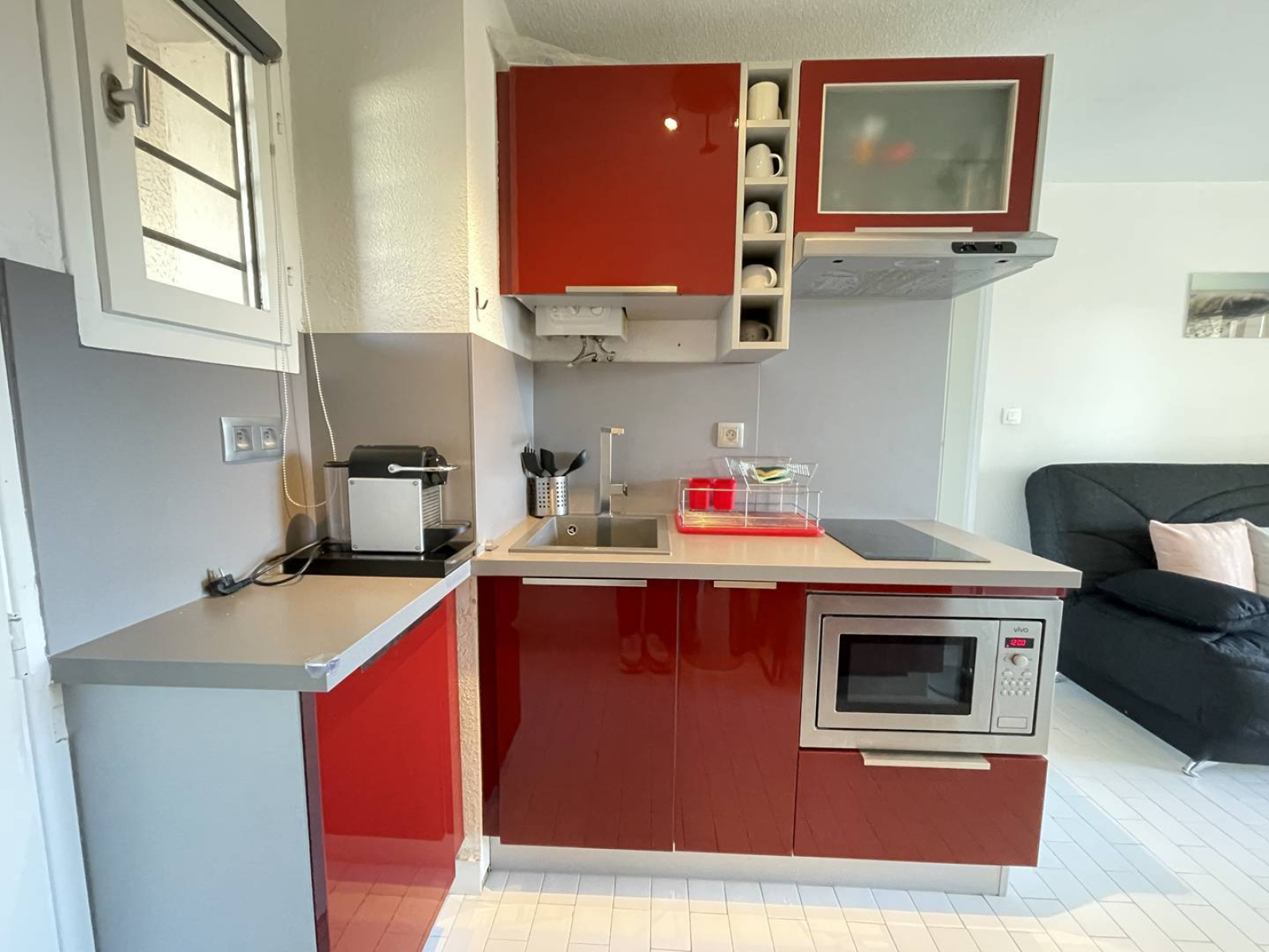 Il se compose d'une lumineuse pièce à vivre avec cuisine ouverte et équipée, d'une chambre avec rangements, d'une cabine avec lits superposés, d'une belle salle d'eau, WC séparés ainsi que d'une terrasse exposée Sud-Est avec petite vue mer !