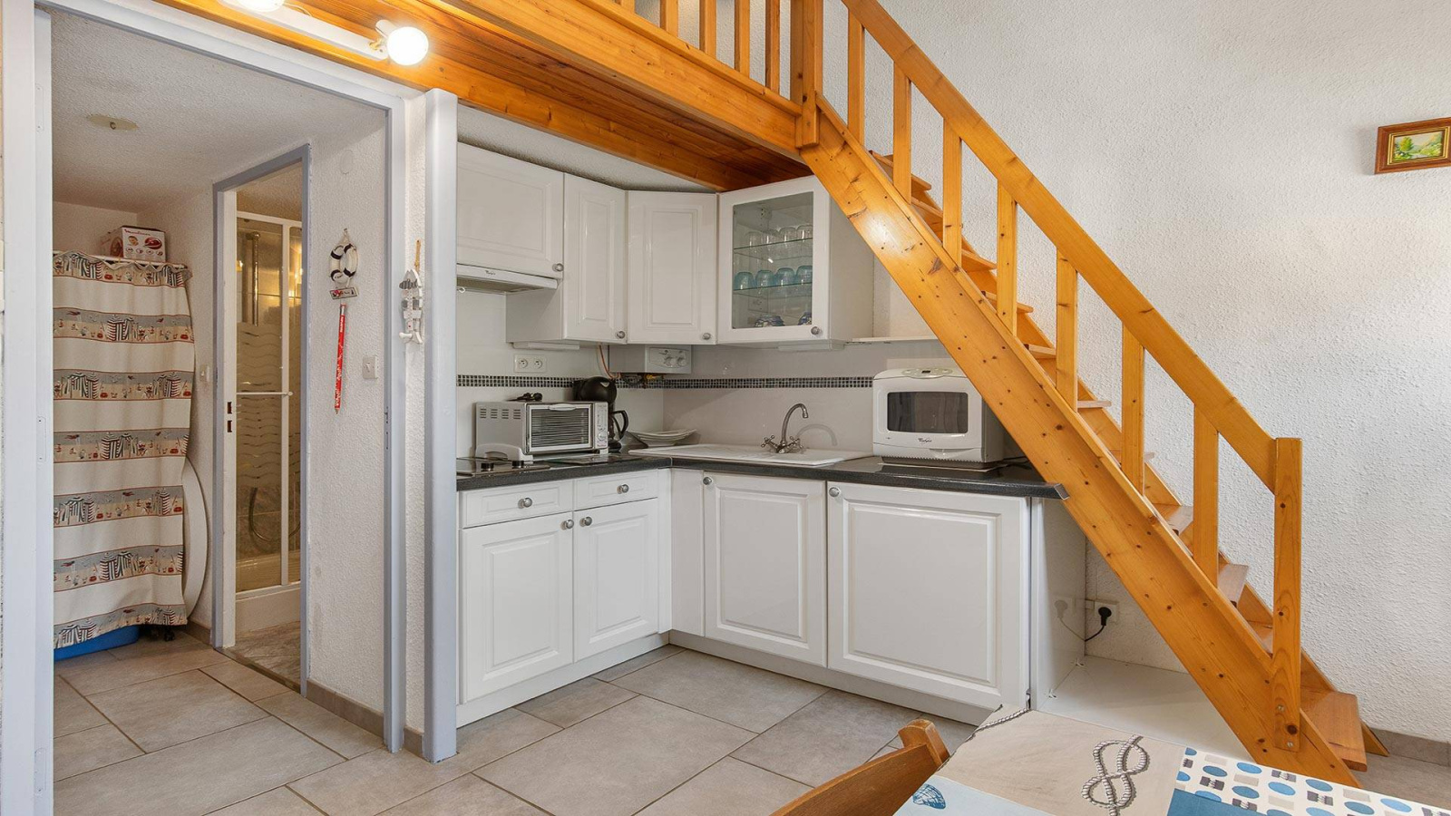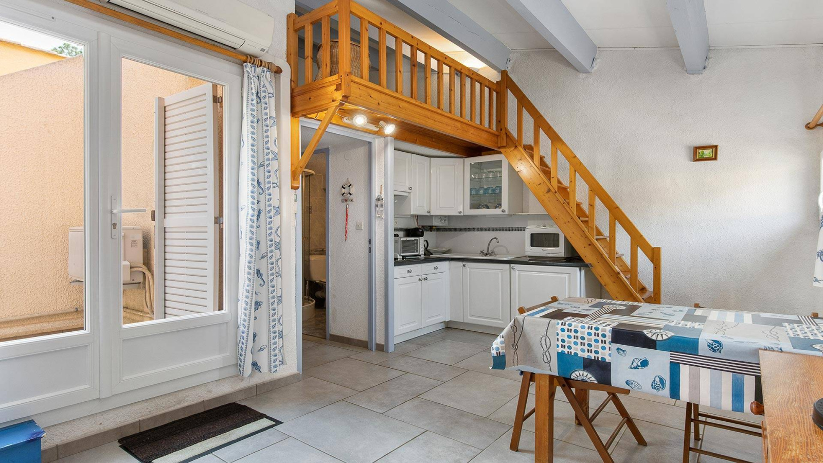 Studio mezzanine climatisé pour 4 personnes dans une résidence arborée au calme. Accès à l’appartement par une belle terrasse à ciel ouvert, pièce de vie avec espace cuisine, une salle d'eau avecWC. Une mezzanine basse accueille un lit pour deux personnes. S