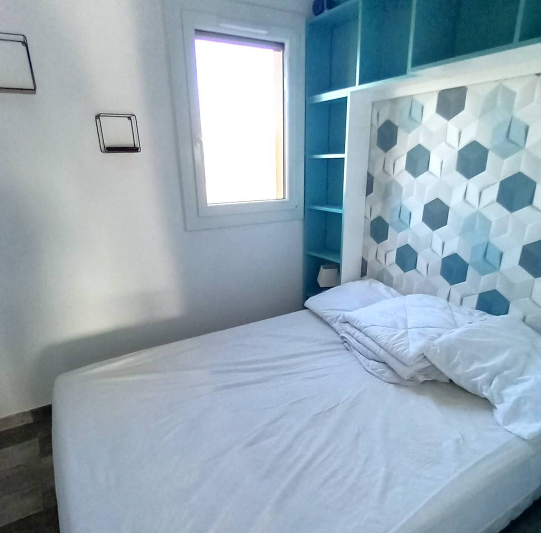 Il est composé d'un séjour cuisine avec canapé convertible, une salle de bain, une chambre avec lit double 140, une cabine fermée avec 2 lits superposés, une loggia de 8m² avec vue sur la piscine et la grande roue. Cet appartement bénéficie d'une place de parking privative.