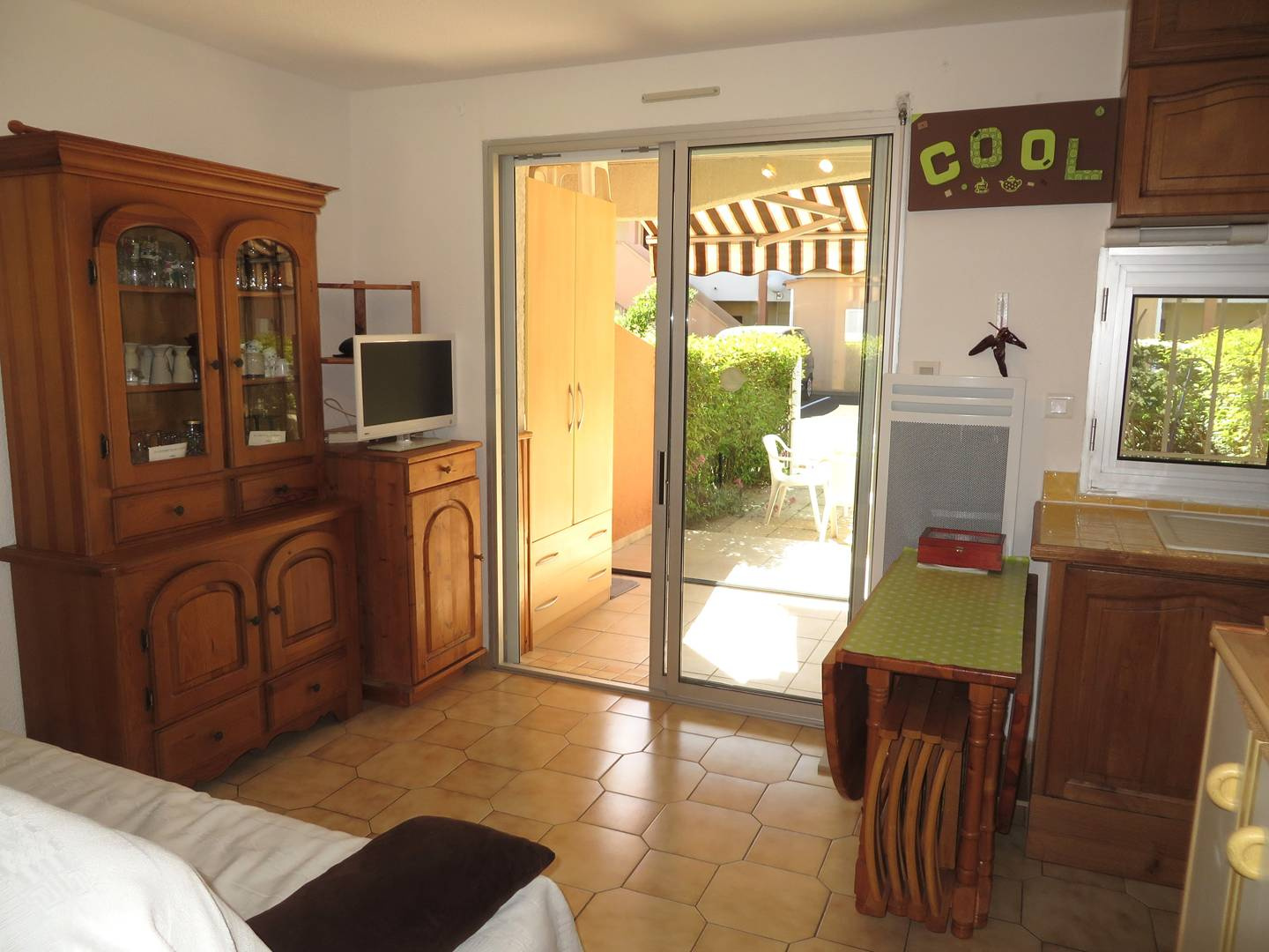Résidence Cap Phoebus- Roquille. Appartement climatisé composé d'un séjour cuisine avec canapé convertible et une petite chambre avec deux lits superposés. La véranda donne sur une grande terrasse ensoleillée.