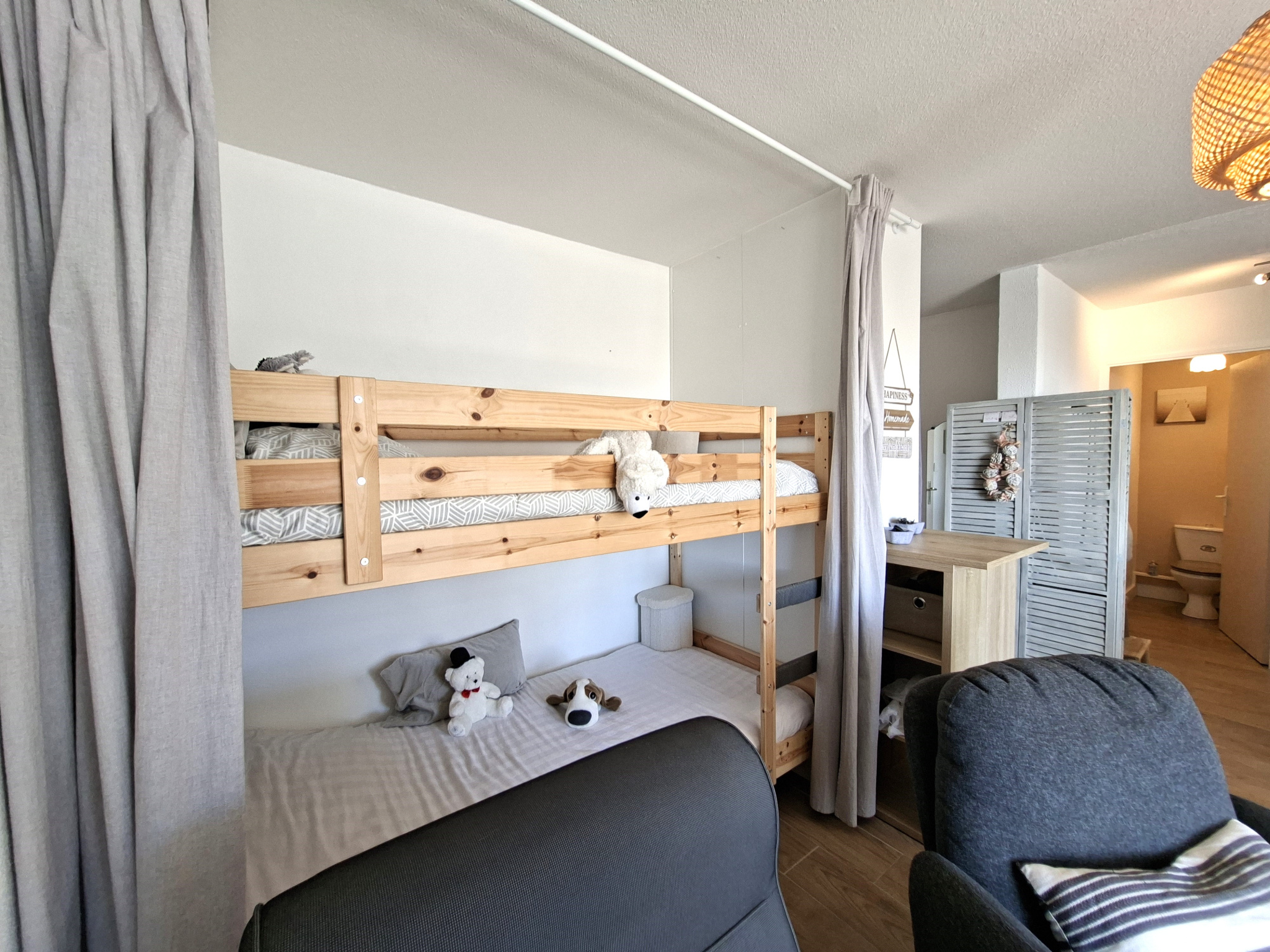 Il se compose d'un séjour avec cuisine entièrement équipée, un espace lits superposés, WC séparés, salle de bain, chambre lumineuse équipée de stores solaires