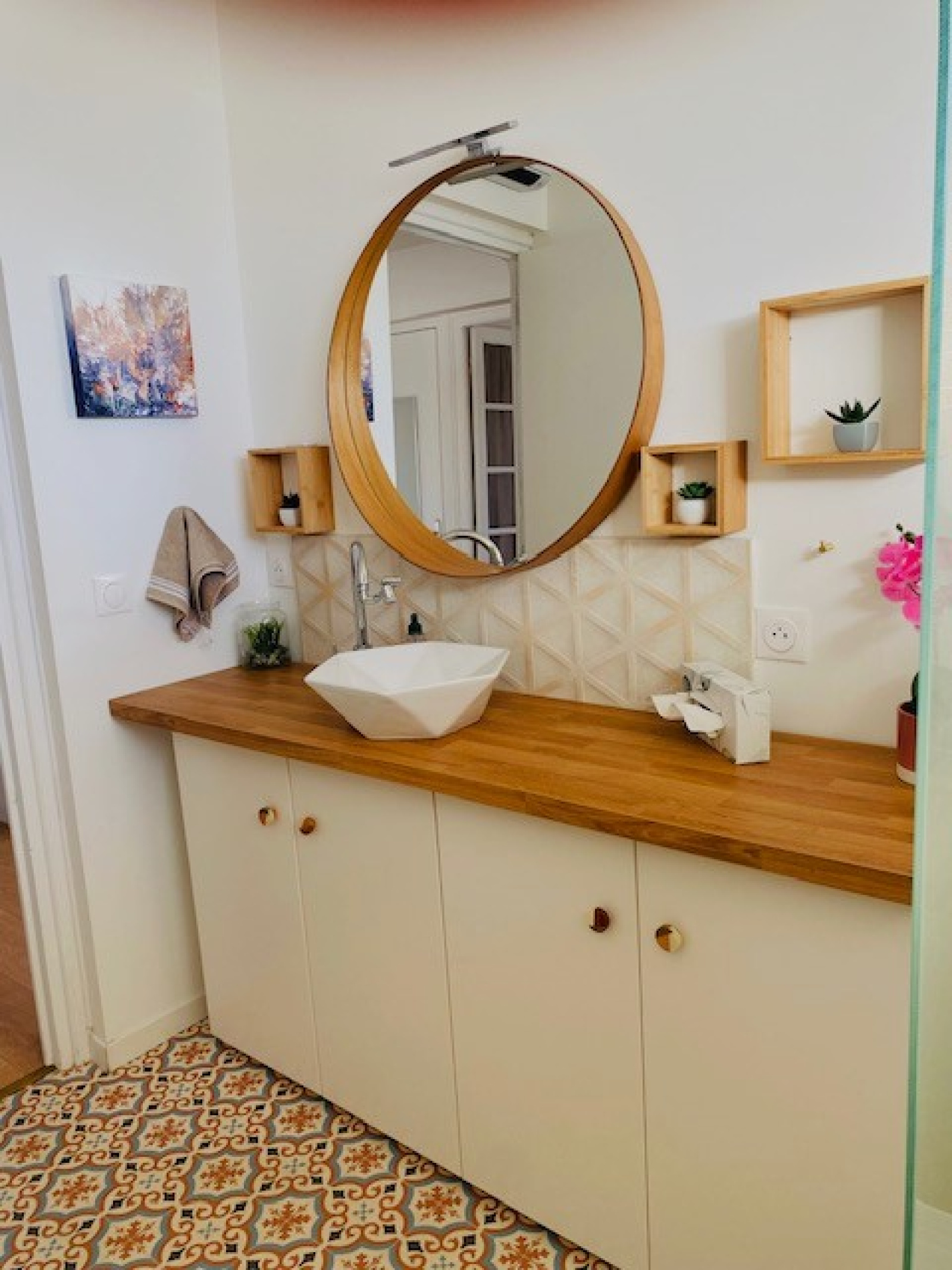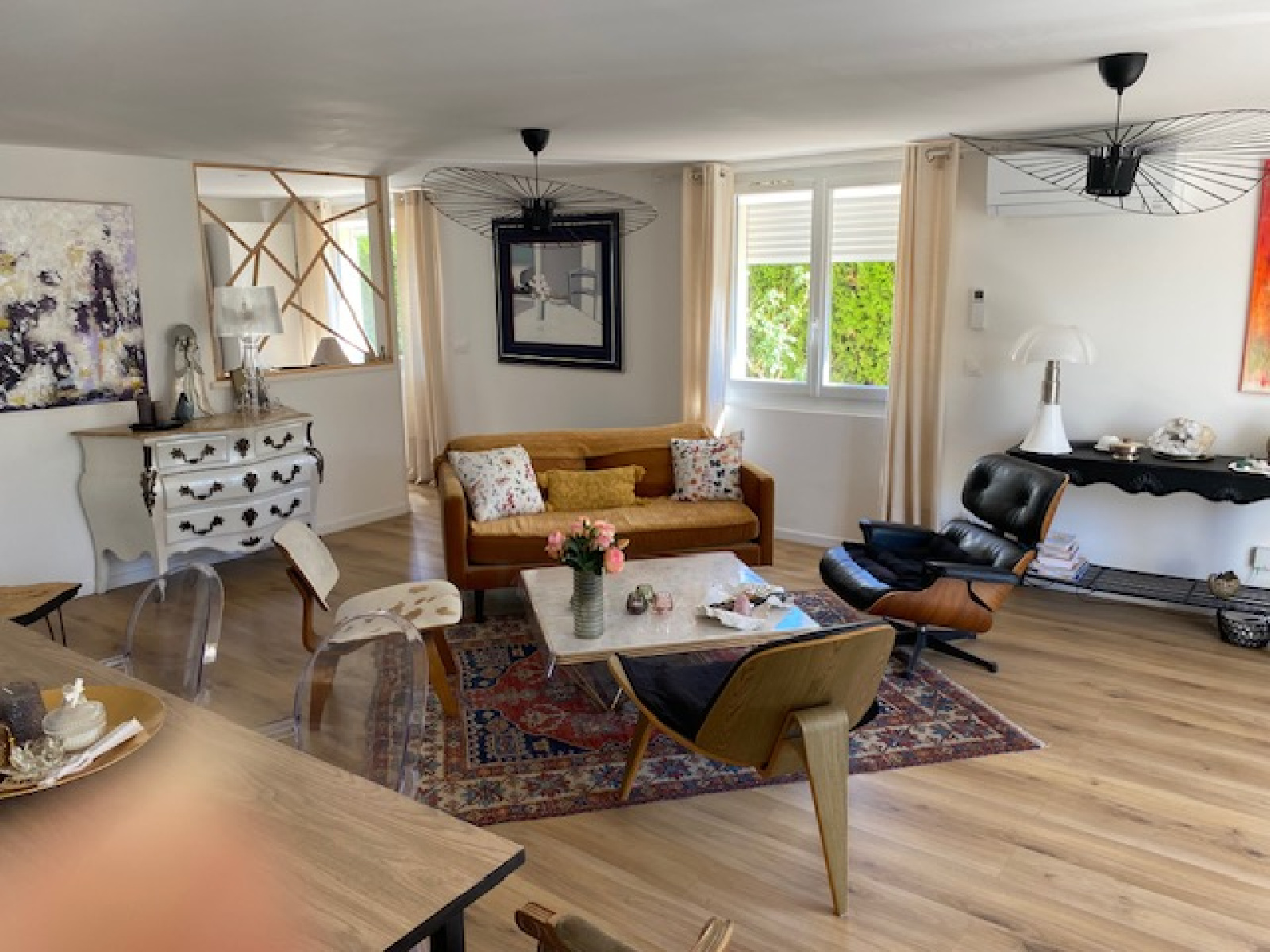 très lumineux d'environ 50 m2, une cuisine aménagée et équipée positionnée dans la véranda à l'arrière avec son accès terrasse et jardin arboré sans vis à vis, une chambre, une salle d'eau, un wc, une buanderie avec un espace garage adapté aux deux roues. A l'étage, on