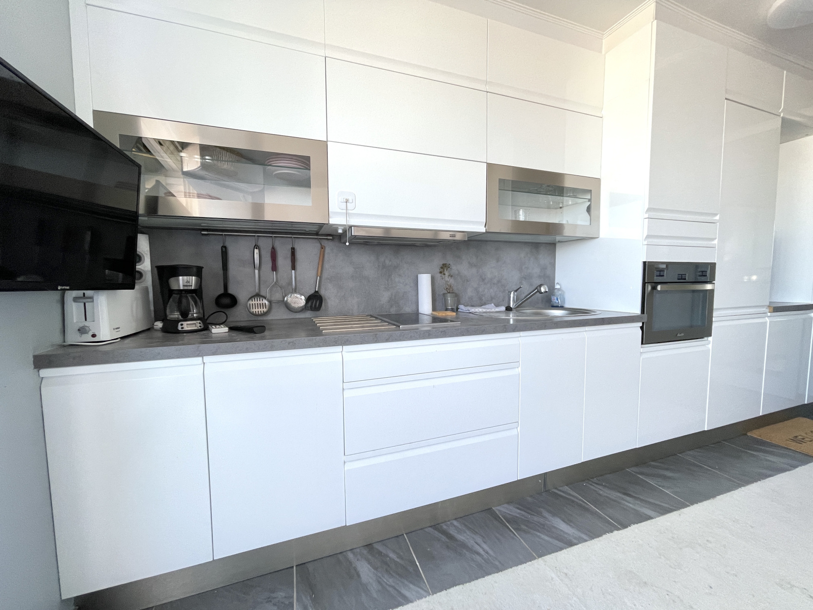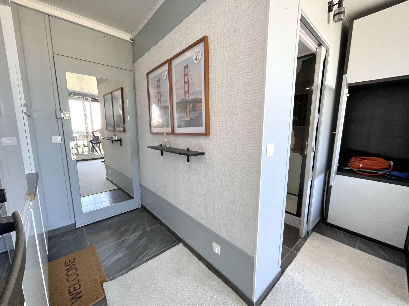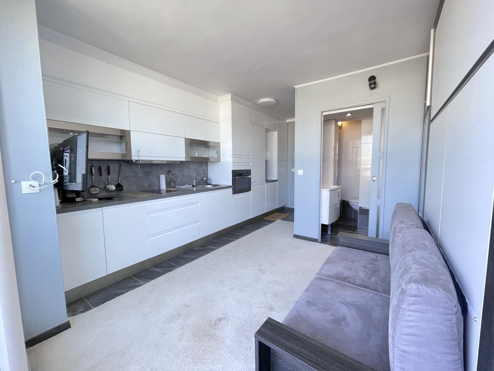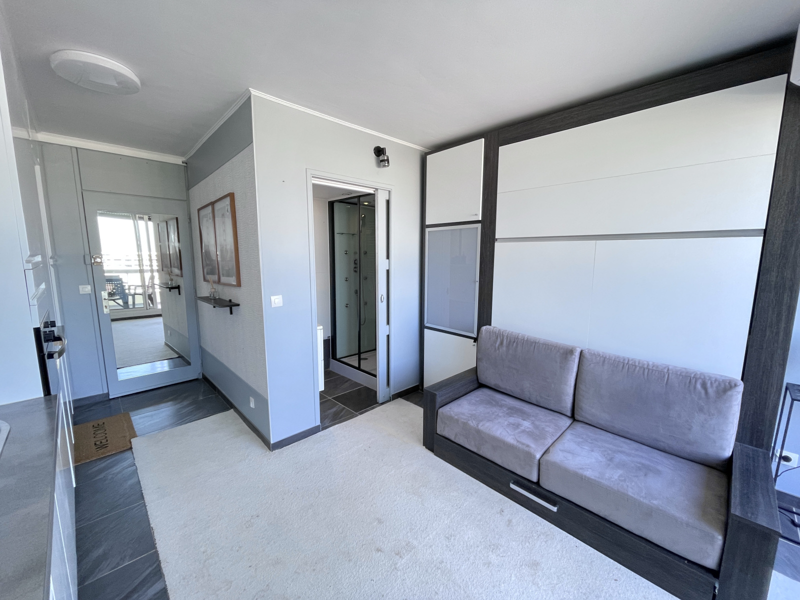Il se compose d’une entrée avec rangements, d’une salle d’eau avec WC, d’une cuisine équipée, et d’un espace de vie lumineux ouvrant sur une grande terrasse avec une belle vue sur la mer.
