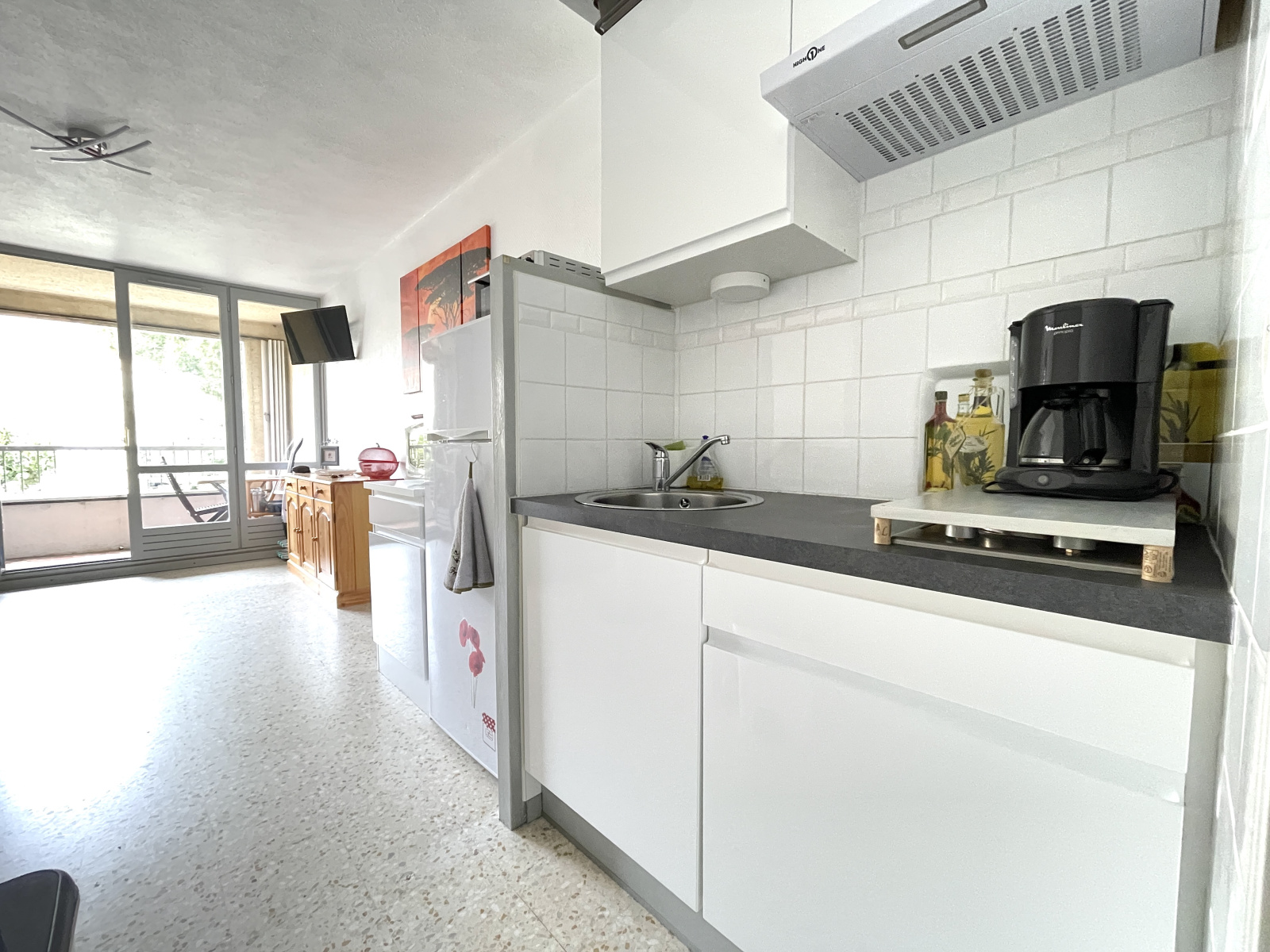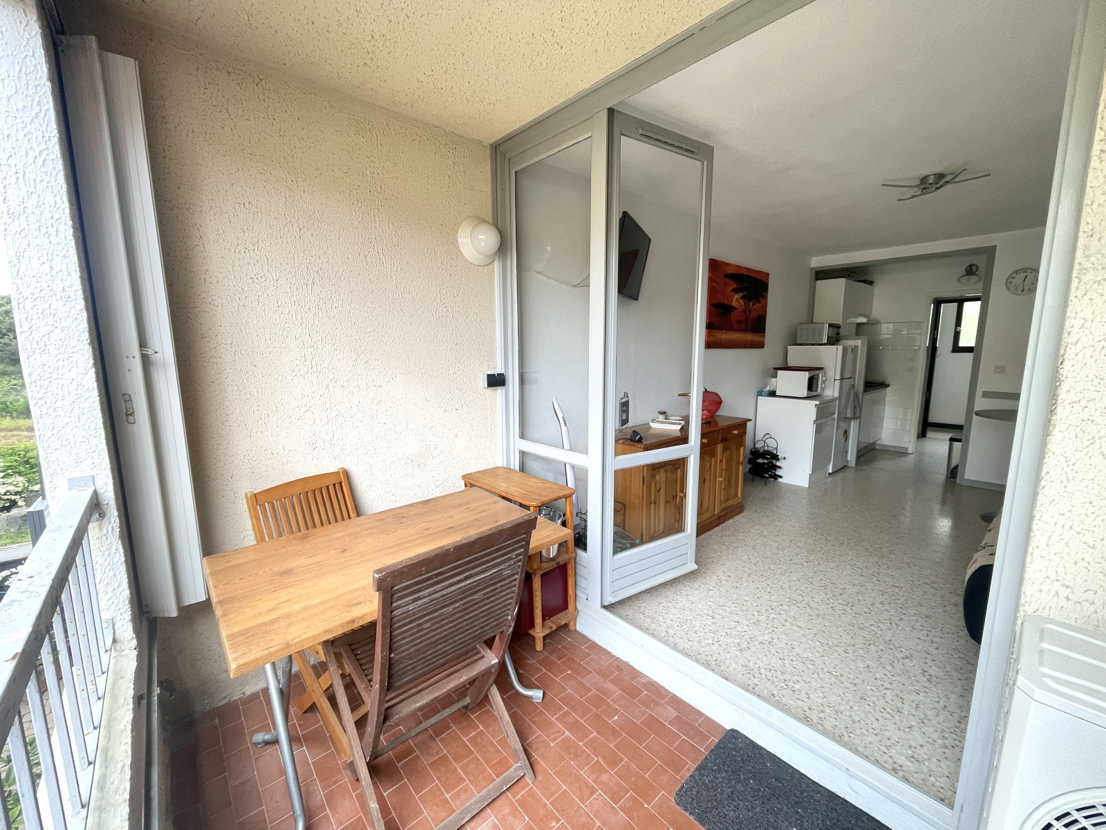 Il se compose d’une entrée avec rangements, d’une salle d’eau moderne et d’une grande pièce de vie lumineuse donnant sur une terrasse exposée sud-ouest.