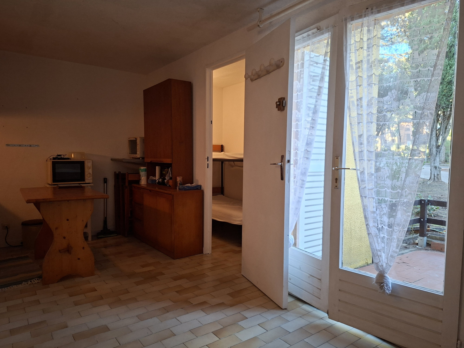 Il se compose d'un séjour cuisine donnant directement sur la terrasse ombragée.